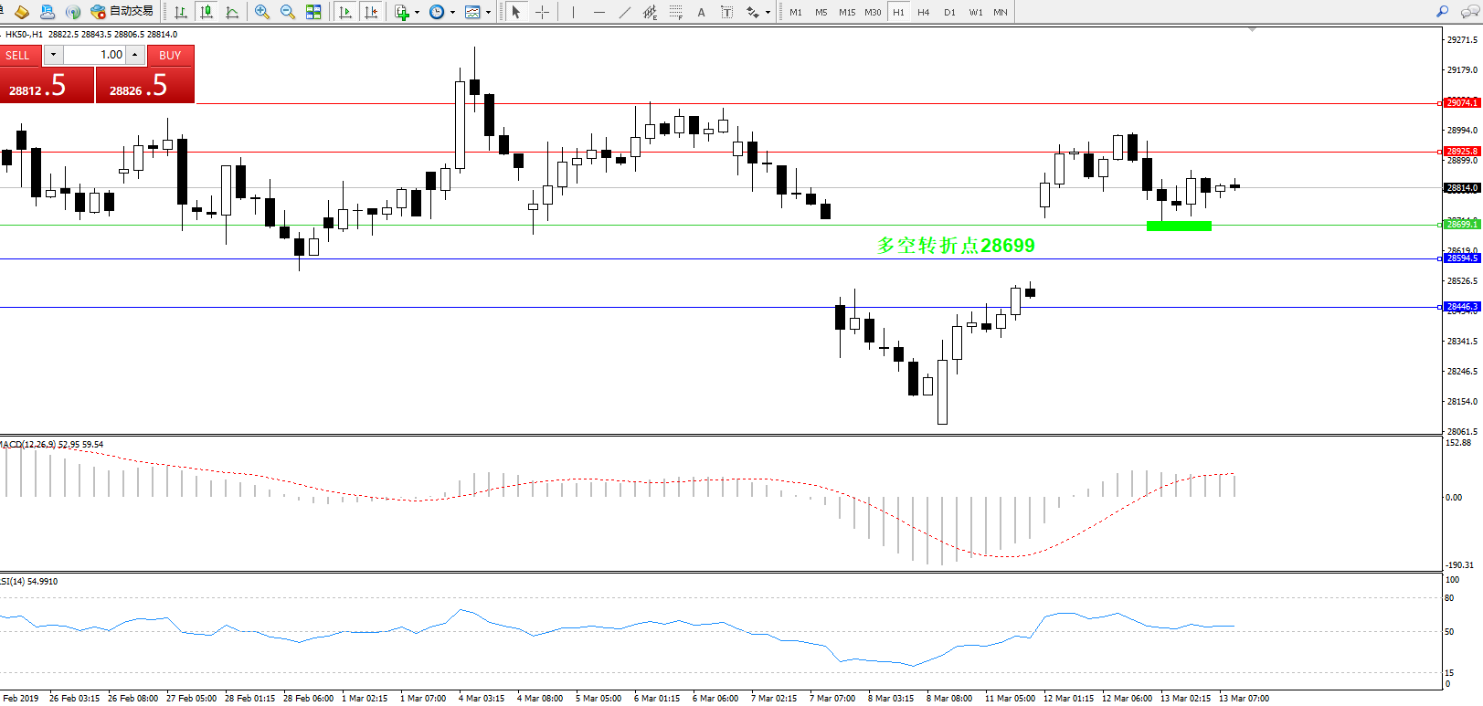 恒指HK50 ——1小时K线图显示: