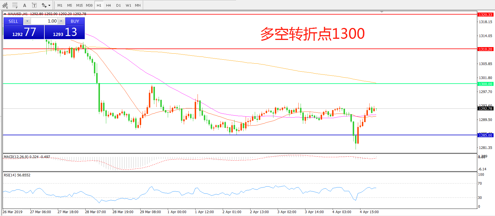 4小时图图看,金价跌破千三心理关口后,以均线系统为依托窄幅震荡,MACD红柱增加,RSI指标拐头,日内有延续震荡可能,重点关注非农表现。
