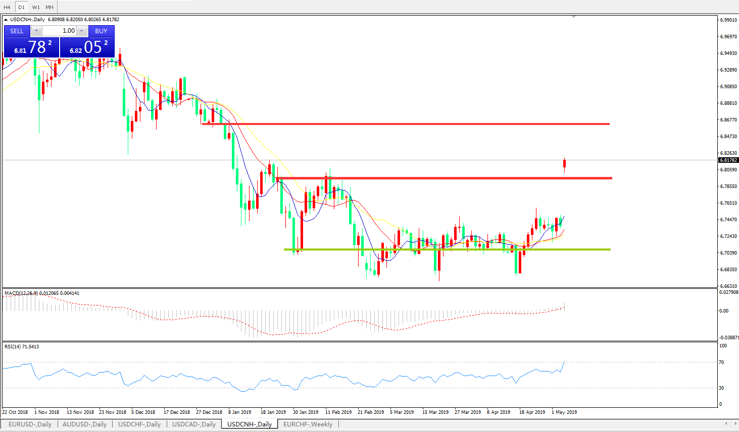 技术面简析:日线图均线呈有序多头排列看多,汇价大幅度高开,MACD上穿0轴且动能柱0轴上方快速放量,RSI急速走升,汇价击穿上方压制继续上行,预计短期汇价或存在整理可能,中期不排除有进一步上行空间,重点关注中美贸易谈判最新进展及特朗普推特更新情况。