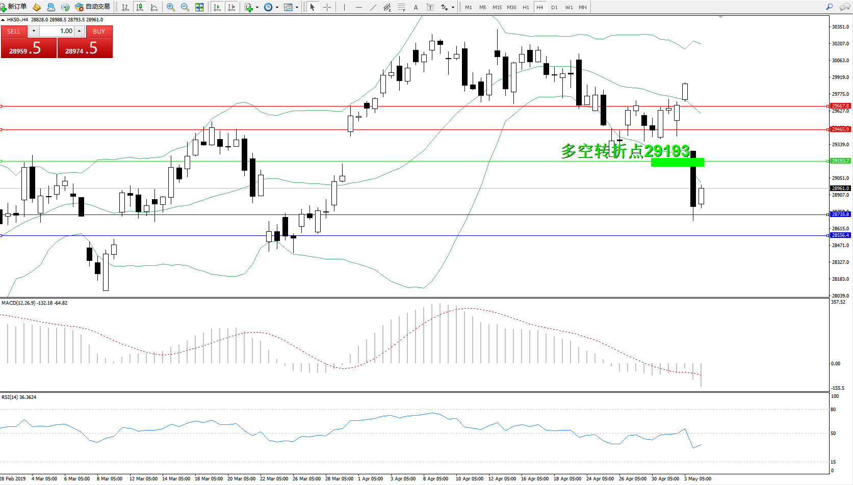 受国际方面的不确定性影响,节后港股大幅低开,恒生指数盘中一度跌破29000点,为3月29日以来首次,日内跌逾1000点,香港恒生指数收盘跌2.9%至29209.82点,创超一个月新低。腾讯控股跌3.15%,小米集团跌6.78%。特朗普在周日下午的Twitter帖子中表示,目前价值2000亿美元的中国商品的10%关税将在周五上涨至25%。他还威胁要“在短期内”对另外3250亿美元的中国商品征收25%的税。中方表示将退出贸易谈判。市场情绪紧张,华尔街将开始大幅抛售。