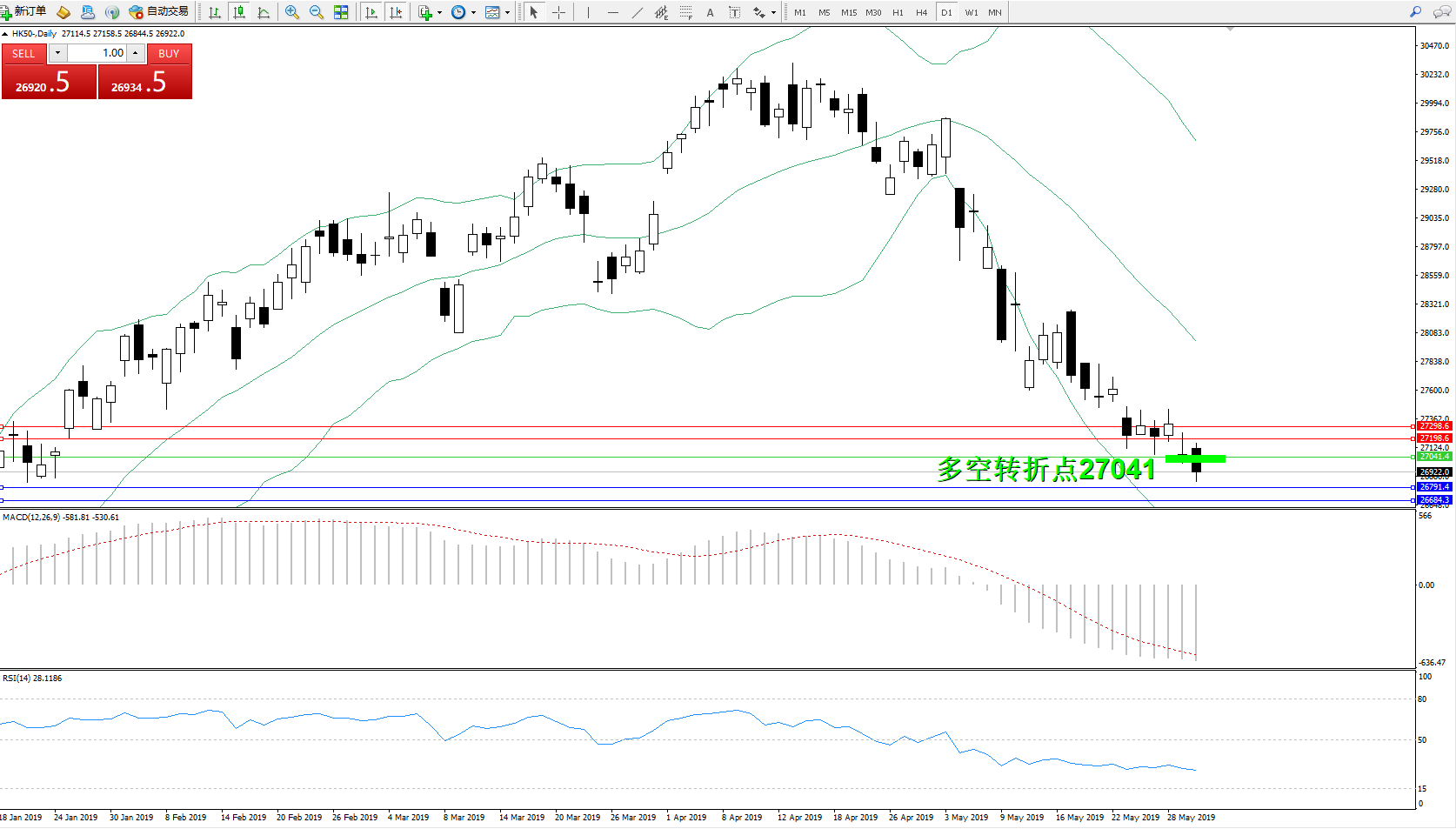 内地股市低开后维持低位震荡,整体呈圆弧状。截至收盘,上证综指跌0.31%,收于2905.81点;香港恒生指数早小幅高开后快速走低,随后维持低位震荡,截至收盘跌0.44%,报27114.88点。中国央行表示,下一步,人民银行将与相关部门一起,积极配合,确保实现国有大行小微企业贷款余额增长30%以上、小微企业信贷综合融资成本降低1个百分点的目标。展望后市,中国国家统计局将于周五亚洲时段早盘公布中国5月官方制造业和非制造业PMI数据。经济学家预计,中国5月制造业PMI将由前一个月的50.1小幅回落至49.9,非制造业PMI将维持在54.3的水平。