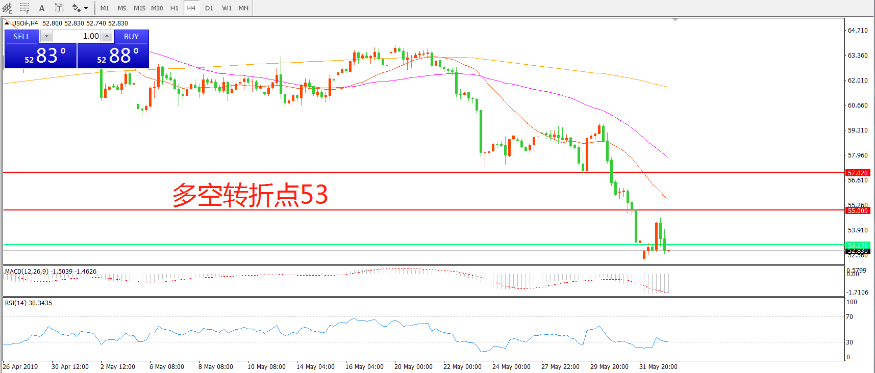4小时图看,油价冲高回落,再次跌至53美金之下,走势偏空,均线系统呈空头排列,MACD绿柱增加,RSI指标有拐头迹象,日内有反弹可能,但整体仍是下行概率较大。