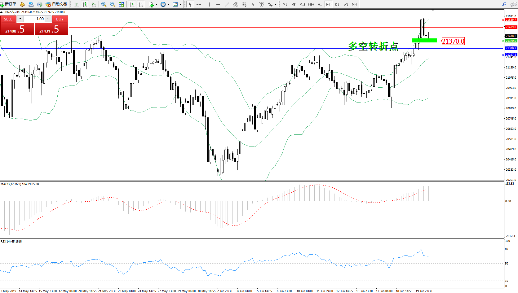 日经225指数6月20日(周四)收盘上涨96.42点,涨幅0.45%,报21447.50点。日本央行公布利率决议,维持利率前瞻指引不变,同时强调至少在2020年春季之前维持极低的利率。日本央行认为海外经济的下行风险上升,必须关注海外经济体的下档风险对日本企业和家庭信心的影响,出口和产出都显示出疲态,日央行长黑田东彦表示需要更多时间才能实现物价目标。一直以来日本央行以2%作为自己的通胀目标,但是日本CPI迟迟未能突破1.5%大关,且随着国内经济进一步的放缓,日本实现2%的通胀目标遥遥无期。