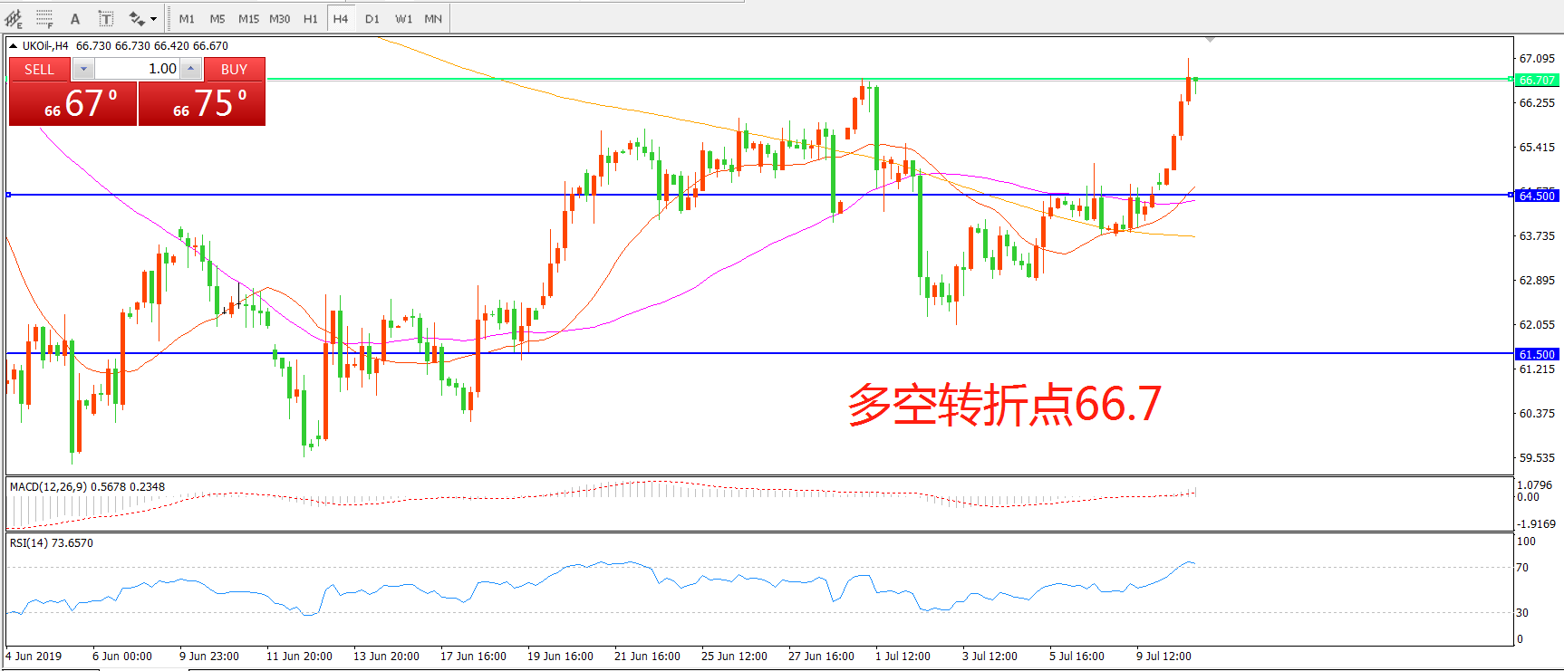 4小时图看,油价阳线连续拉升,短期走势偏强,短期均线拐头向上,MACD红柱增加, RSI指标走平,如能突破站稳66.7,日内延续上行概率较大。