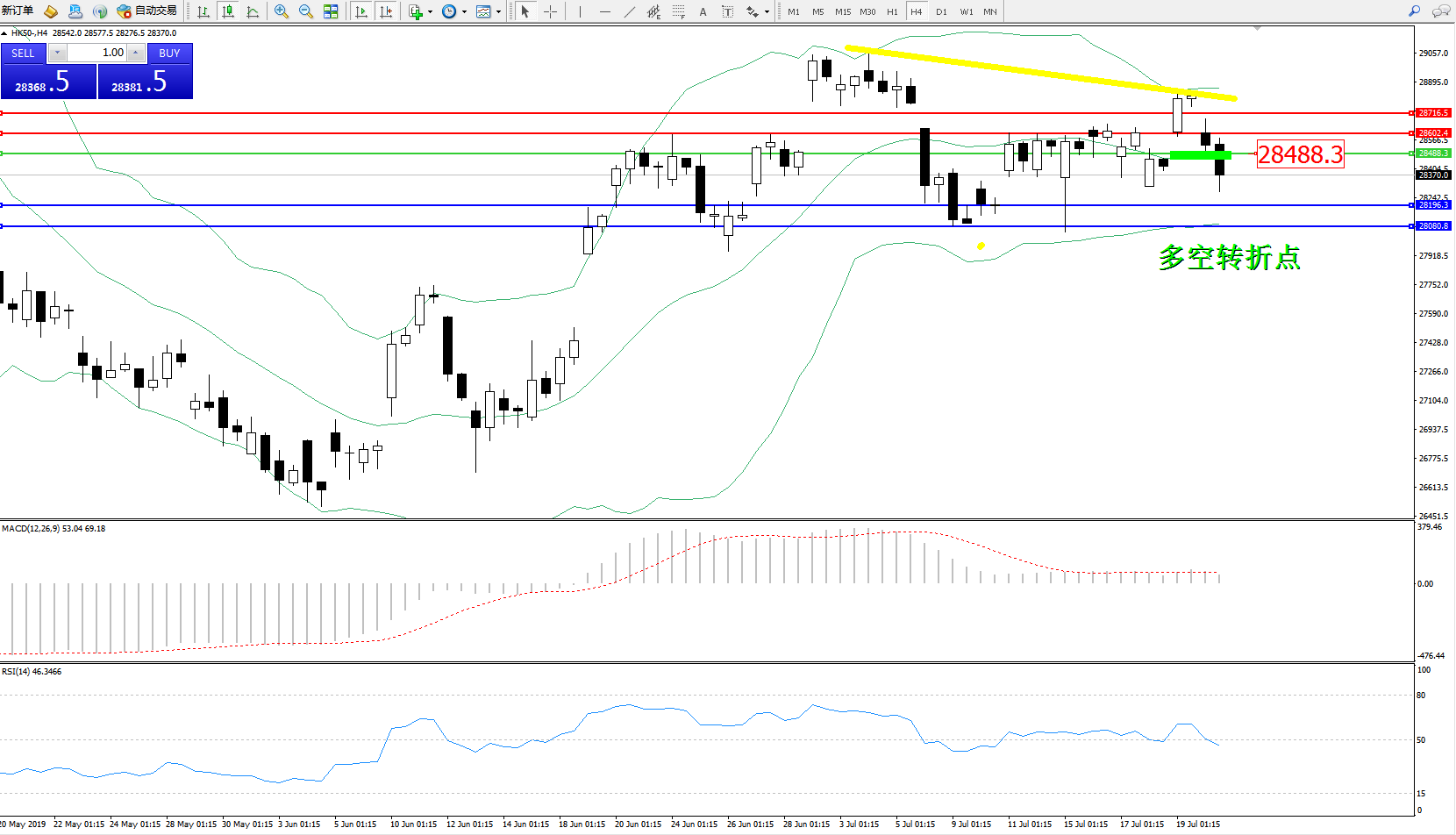 恒生指数(周一)收盘跌394.14点或1.37%,报28371.26点,全日成交额达677.5亿。港股继续弱势震荡,始终后市变数仍多,虽然上周五见反弹,但拉锯格局似乎仍难有改变,尤其是成交量依然未见显著增加。今日焦点可能会集中于内地科创板,皆因内地科创板正式开板,表现相信会对港股短期有一定启示。不过,预期港股仍只会于区间上落,继续于28000至29000点徘徊。