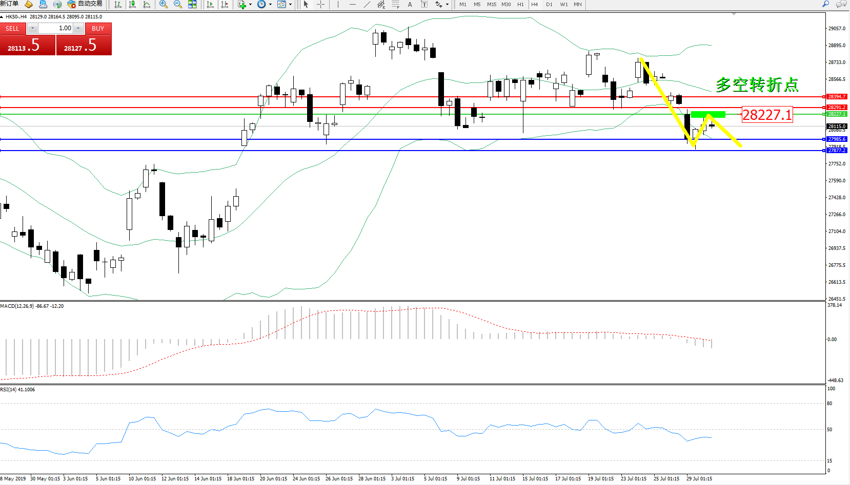 香港恒生指数7月30日(周二)收盘上涨40.09点,涨幅0.14%,报28146.50点;暴力示威事件持续,市场忧对经济打击加深,地产收租股及自由行消费股成跌市重灾区,珠宝股,濠赌股都齐挫。期表现较差的板块,除了重债内房,以及中资电讯股外,本地地产股亦从高位回挫不少,而且向好走势多已转坏。预计本地股跌势持续,这类股份盈利风险来自内地及本港经济放缓,料调整未完,但个别公司派息不俗,可以留意吸纳机会。