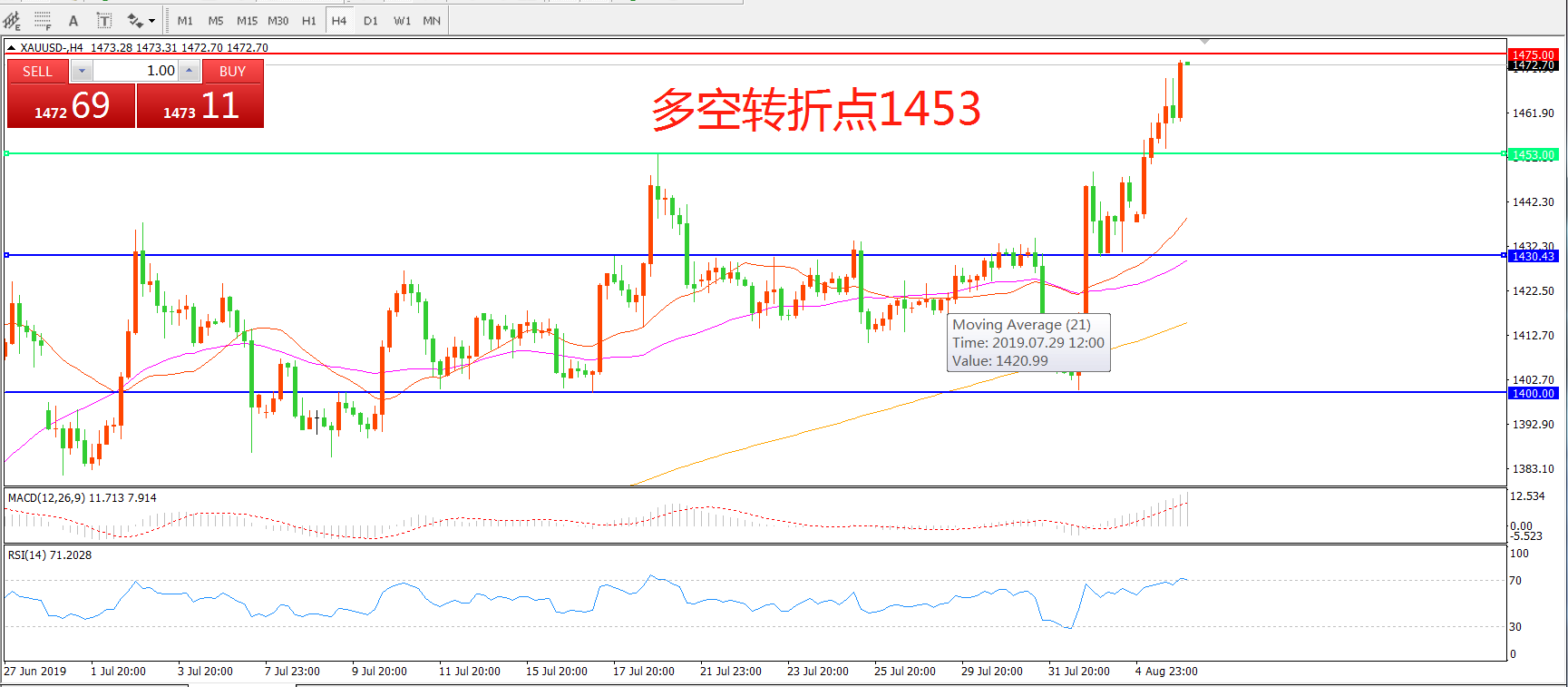 多空转折点:1453.00
