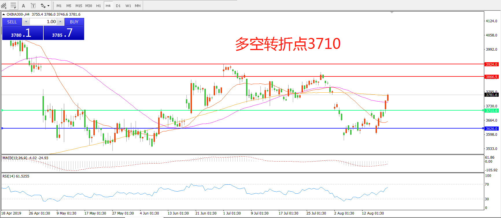 4小时图看,沪深300指数长阳连续反弹,整体走势偏强,均线系统拐头,MACD绿柱减少,红柱增加,RSI指标向上,日内延续上行概率较大。