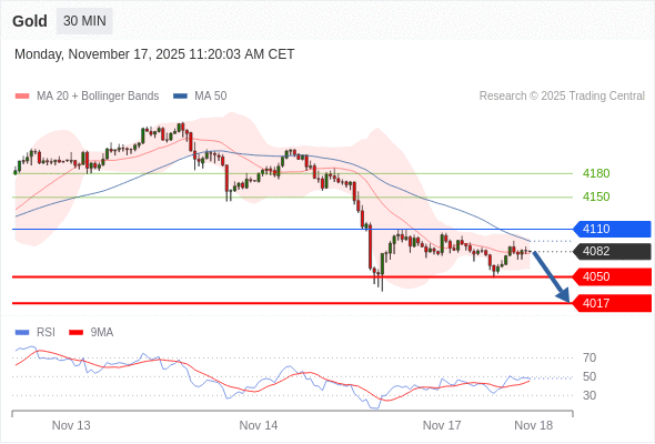 在 4110 之下,看跌,目标价位为 4050 ,然后为 4017 。