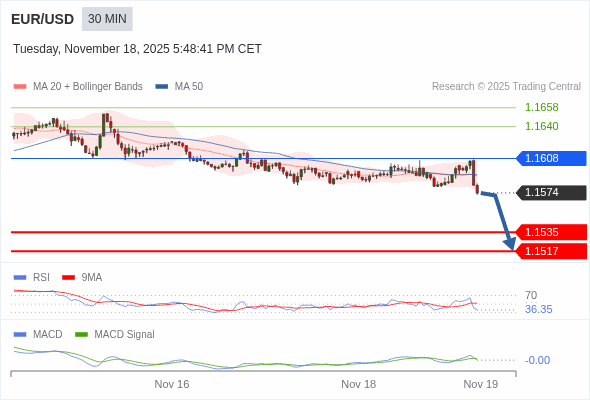 欧元/美元 当日内 : 看跌,在 1.1608 之下。