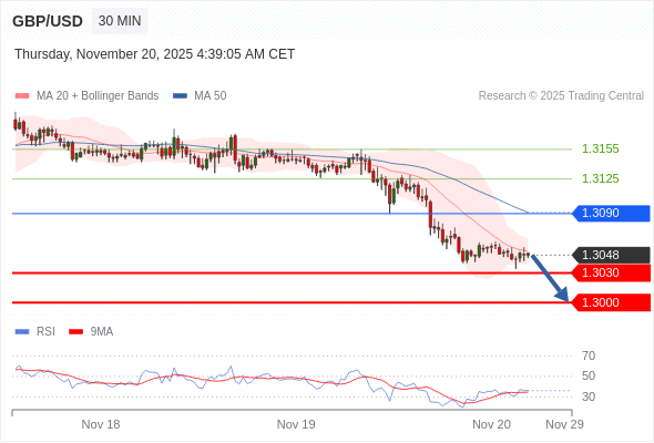 在 1.3090 之下,看跌,目标价位为 1.3030 ,然后为 1.3000 。