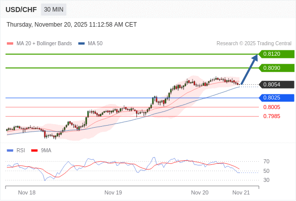 在 0.8025 之上,看涨,目标价位为 0.8090 ,然后为 0.8120 。