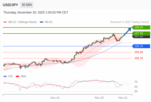 在 156.70 之上,看涨,目标价位为 157.75 ,然后为 158.25 。