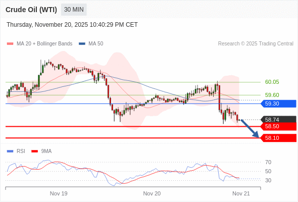在 59.30 之下,看跌,目标价位为 58.50 ,然后为 58.10 。