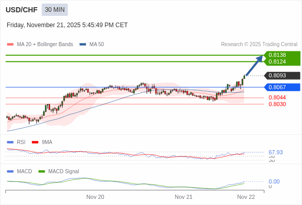 美元/瑞郎 当日内 : 看涨,当 0.8067 为支撑位。
