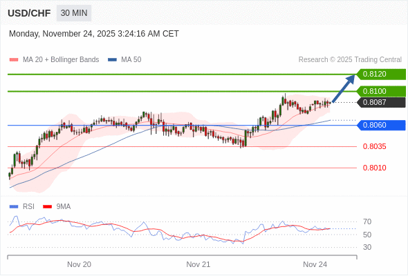 在 0.8060 之上,看涨,目标价位为 0.8100 ,然后为 0.8120 。