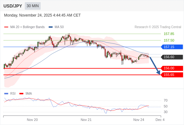 在 157.15 之下,看跌,目标价位为 156.00 ,然后为 155.65 。