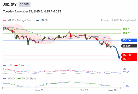 美元/日元 当日内 : 看跌,在 156.54 之下。