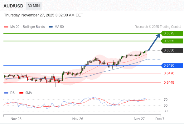 在 0.6490 之上,看涨,目标价位为 0.6555 ,然后为 0.6575 。