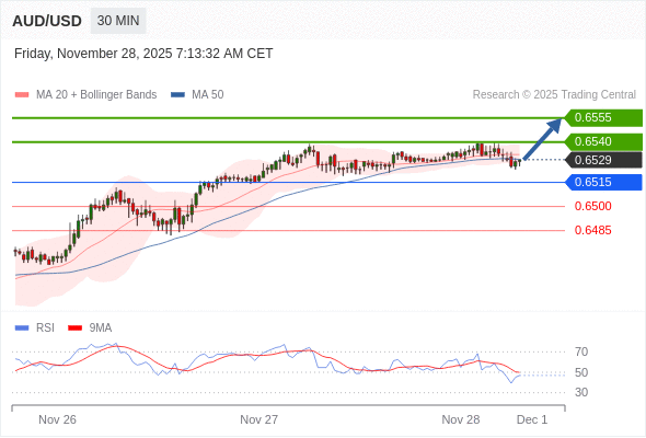 在 0.6515 之上,看涨,目标价位为 0.6540 ,然后为 0.6555 。