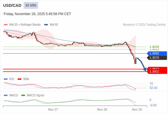 美元/加元 当日内 : 看跌,在 1.3992 之下。