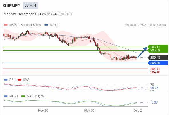 英镑/日元 当日内 : 有上涨的可能,目标价位定在 206.11 。