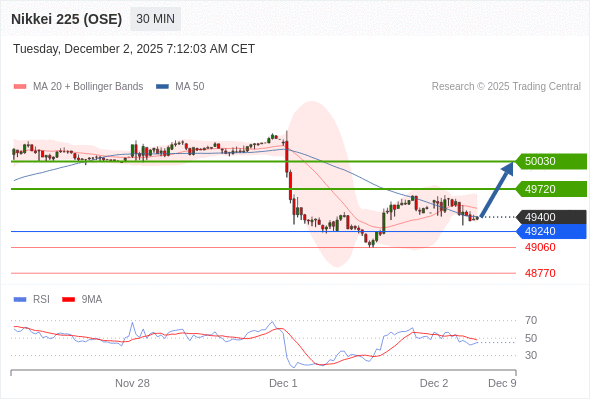 日经225股指期货 (OSE) 当日内: 在49240之上,看涨。