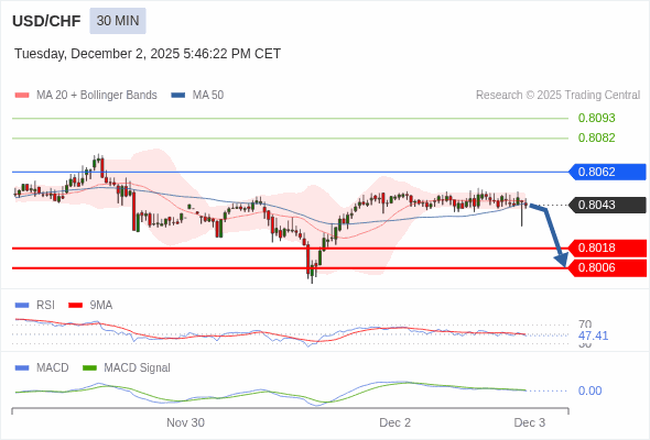 美元/瑞郎 当日内 : 看跌,当 0.8062 为阻力位。