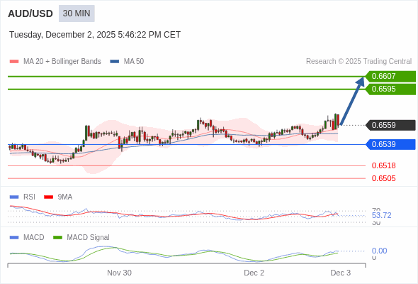 澳元/美元 当日内 : 看涨,当 0.6539 为支撑位。