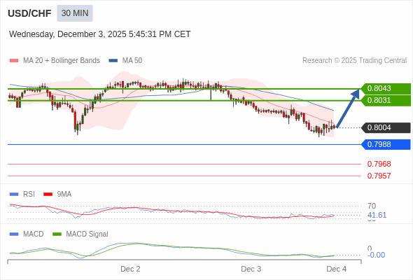 美元/瑞郎 当日内 : 有上涨的可能,目标价位定在 0.8043 。