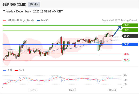 在 6843 之上,看涨,目标价位为 6878 ,然后为 6890 。