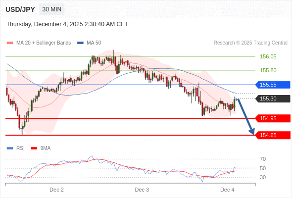在 155.55 之下,看跌,目标价位为 154.95 ,然后为 154.65 。