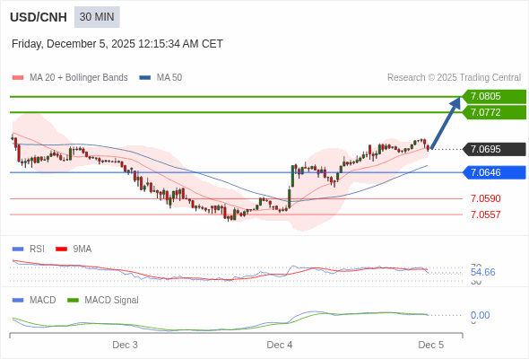 美元/人民币 当日内 : 看涨,当 7.0646 为支撑位,目标定在7.0805。