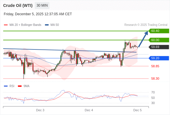 在 59.20 之上,看涨,目标价位为 60.00 ,然后为 60.40 。