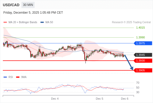 在 1.3975 之下,看跌,目标价位为 1.3930 ,然后为 1.3905 。