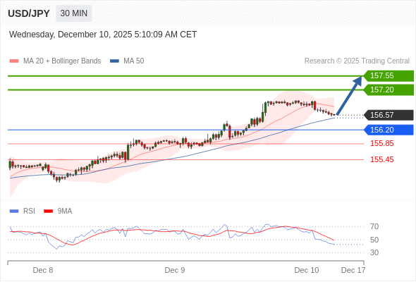 在 156.20 之上,看涨,目标价位为 157.20 ,然后为 157.55 。