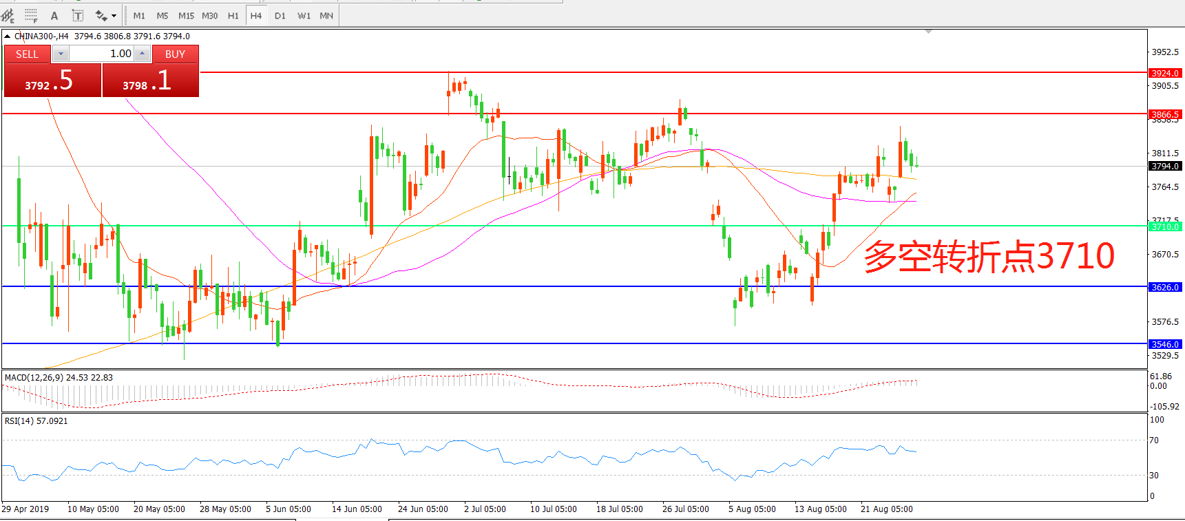 4小时图看,沪深300指数维持高位震荡,日内虽有小幅回落,但整体表现强势,55周期均线系统走平,形成下方支撑,MACD红柱增加,RSI指标向上,日内延续上行概率较大。