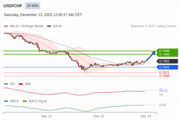 美元/瑞郎 当日内 : 看涨,当 0.7941 为支撑位。