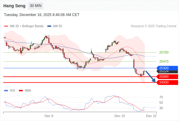 恒生指数 当日内: 短期关键阻力位在25300。