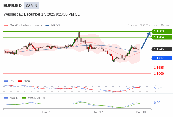 欧元/美元 当日内 : 看涨,当 1.1717 为支撑位。