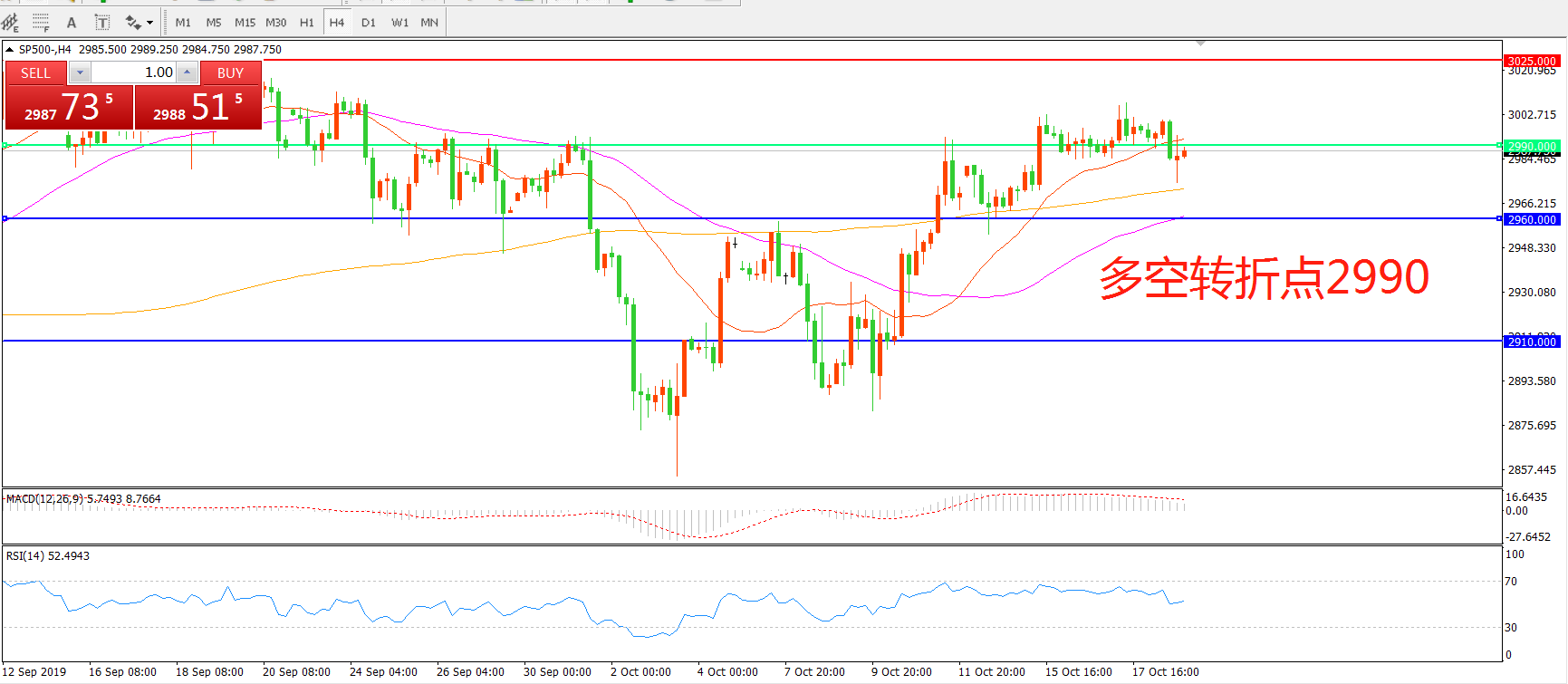4小时图看,标普500维持高位震荡,2990成为短期多空分水岭,均线系统走平,MACD红柱减少,RSI指标走平,日内延续震荡概率较大。