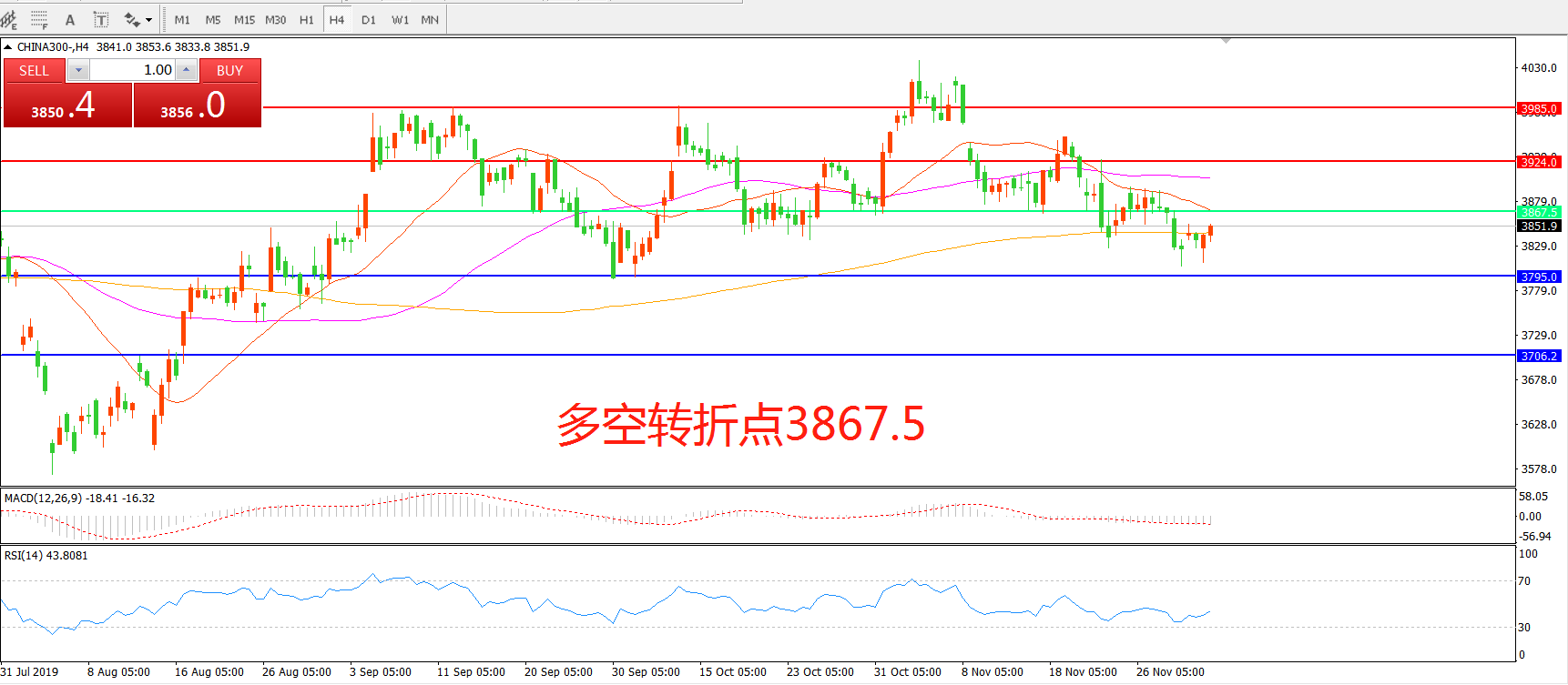4小时图看,沪深300延续低位震荡,200周期均线成为短期争夺焦点,整体走势仍显低迷,MACD绿柱增加,RSI指标向下,日内延续震荡概率较大。