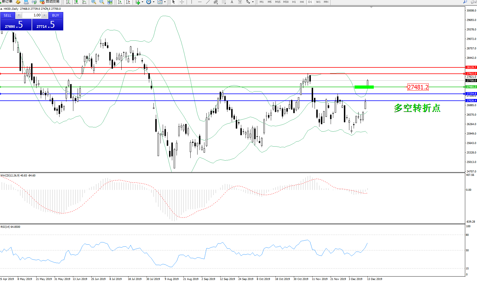 香港恒生指数12月13日(周五)跳空上扬,收盘大涨693.62点,涨幅2.57%,报27687.76点;港股各大机构近日陆续发布2020年策略报告,海外市场当前由风险偏好回升驱动的整体反弹持续性有限,行情分化将重新加剧。利率上行将削弱低估值市场吸引力,而高增长市场将受青睐。此前美国总统特朗普发表的关税方面言论,提振了市场乐观情绪,美股三大指数盘初刷新历史新高。
