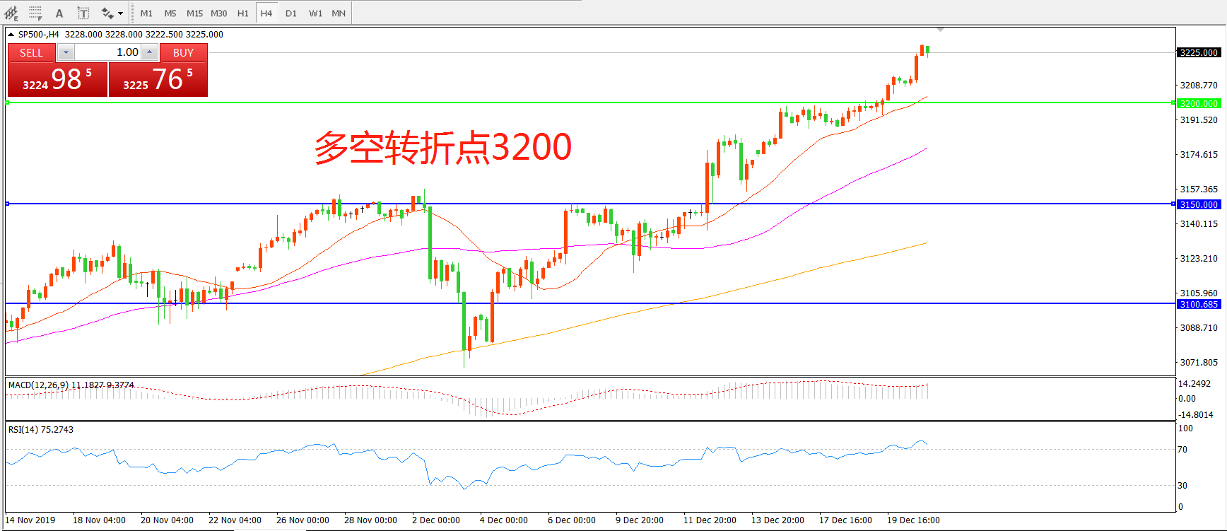 上周五,美国商务部公布报告称,第三季度美国GDP的年化增长率终值为2.1%,与上个月公布的第二版数据相比未做修正美国经济增长符合预期,贸易形势和经济前景乐观预期提振了人气和信心,随着圣诞假期的临近,又一个重要时间窗口出现。华尔街通常将每年最后五个交易日和新年的前两个交易日的市场表现称为“圣诞老人行情”,股市往往表现异常强劲。今年标普500指数涨幅超过28%,并站上了3200点,有望创下1997年来最大涨幅,投资者有理由相信涨势不会在短期内结束。