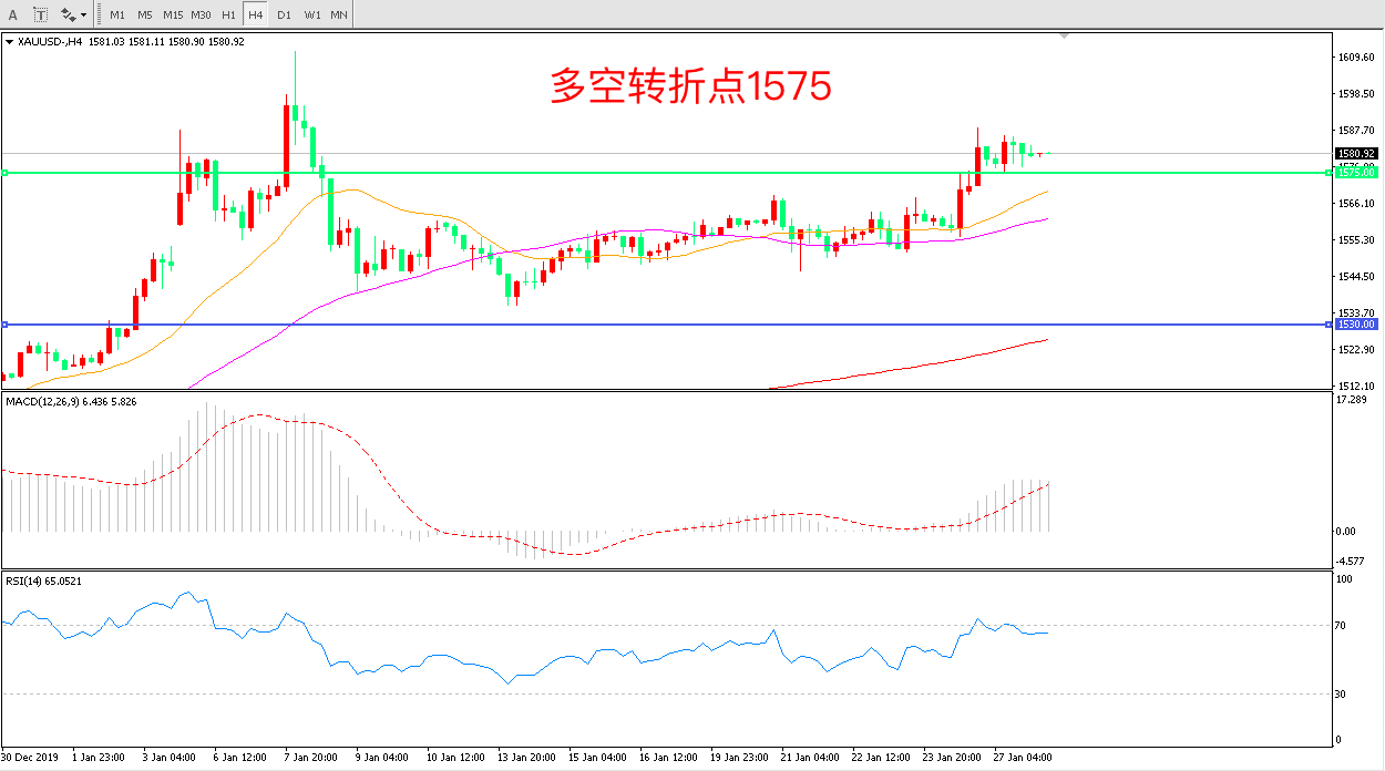 4小时图看,金价跳空高开,强势突破1575阻力,短期走势偏强,均线系统有拐头迹象, MACD红柱增加,RSI指标向上,短期金价维持上行概率较大。