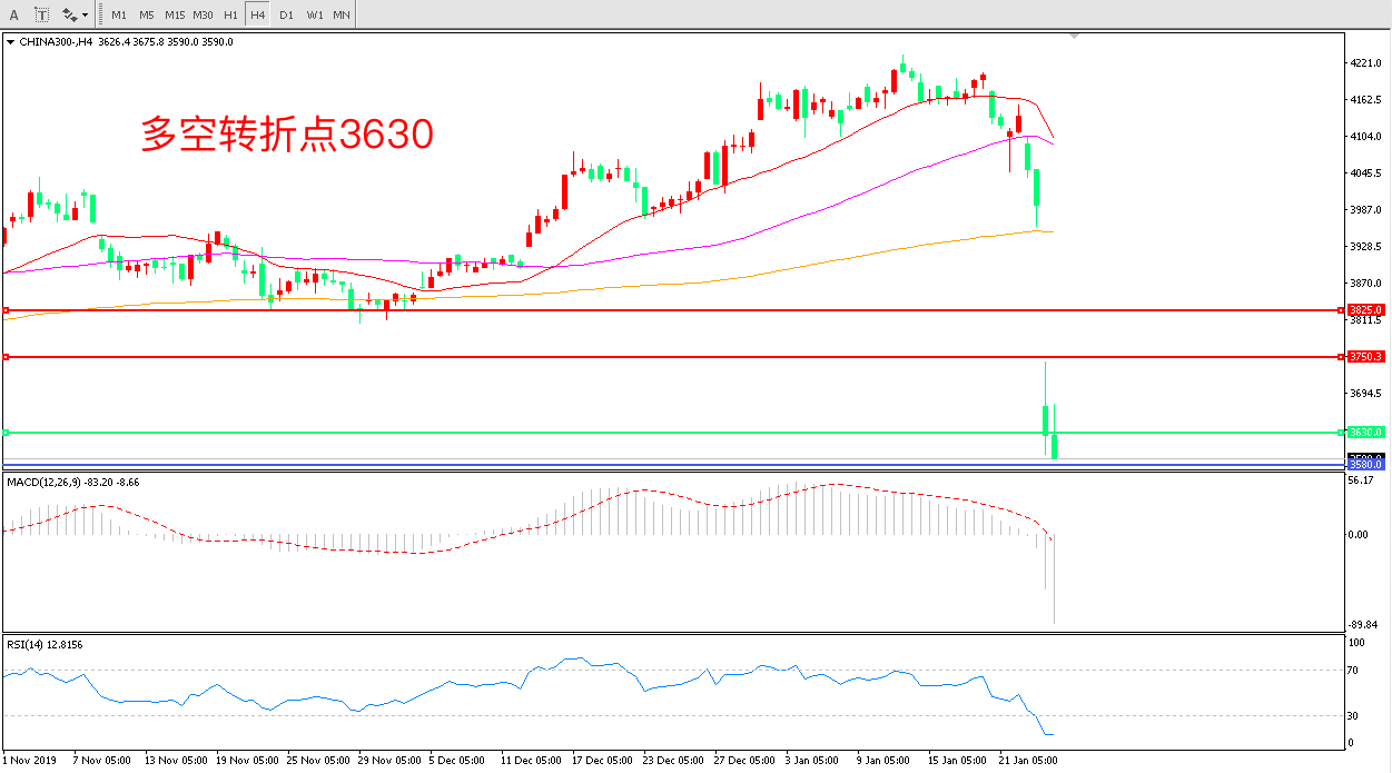 4小时图看, 沪深跳空低开,震荡下行,整体走势低迷,3580成为短期支撑,均线系统拐头向下,MACD红柱缩短,RSI指标向下,日内延续下行概率较大。
