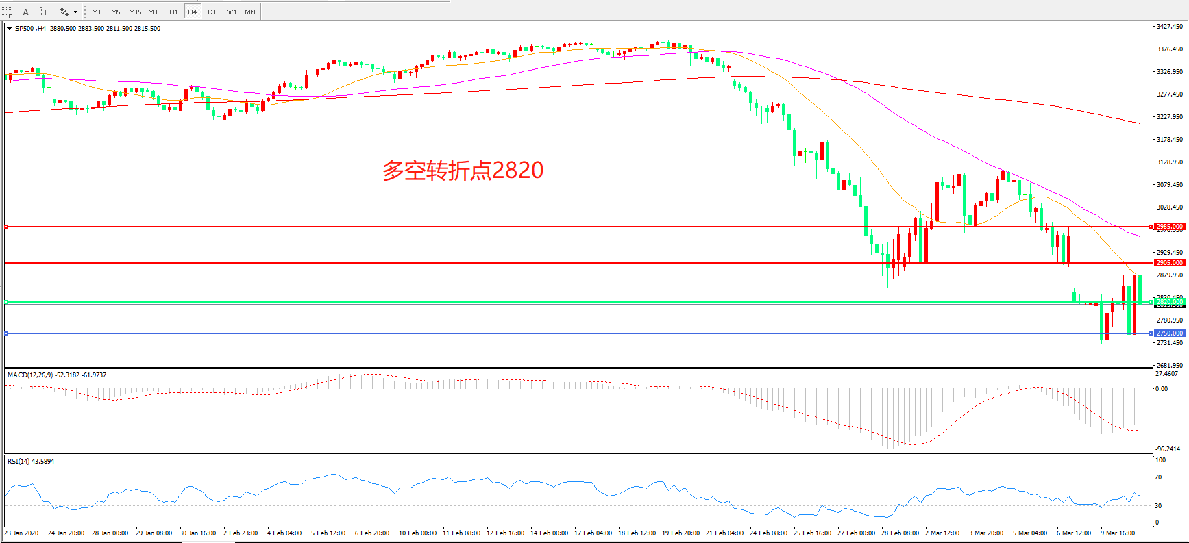 4小时图看,标普呈现区间震荡走势,2905成为上方阻力,2750成为短期支撑,均线系统呈空头排列,MACD绿柱减少,RSI指标向下,中期走势依然偏空。