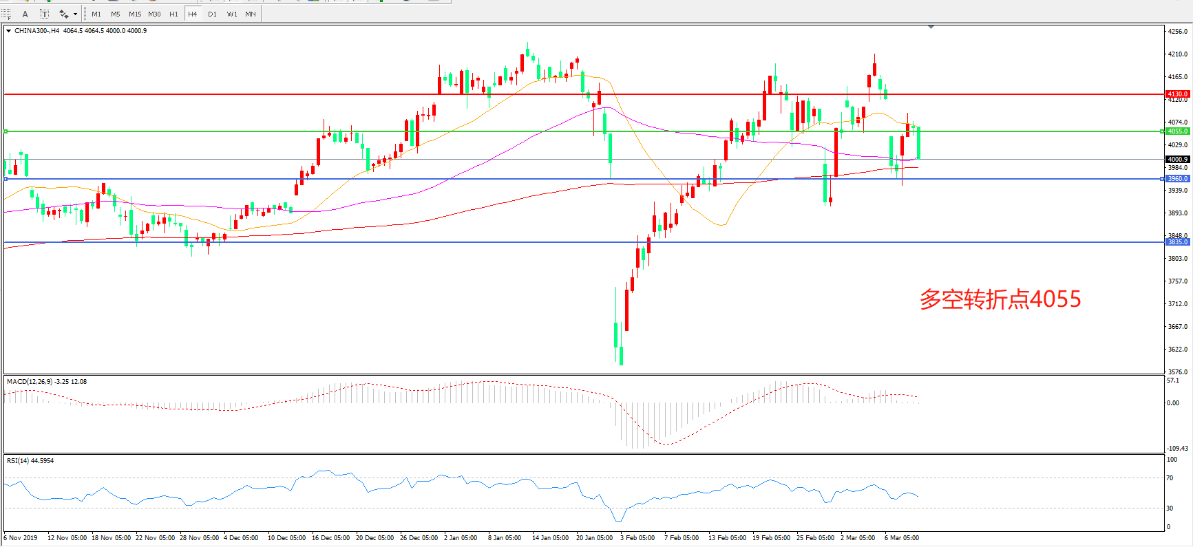 4小时图看,沪深300呈现区间震荡走势,4055成为短期阻力,3960成为下方支撑,均线系统走平,MACD红柱缩短,RSI指标向下,日内延续震荡概率较大。