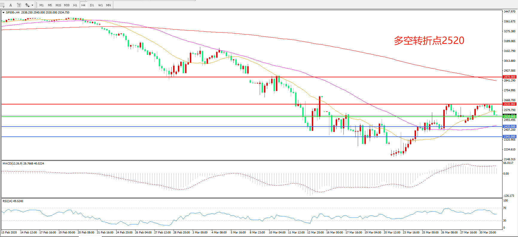 4小时图看,标普500冲高回落,触碰2630一线后再度下行,均线系统走平,MACD红柱减少,RSI指标走平,日内延续震荡概率较大。