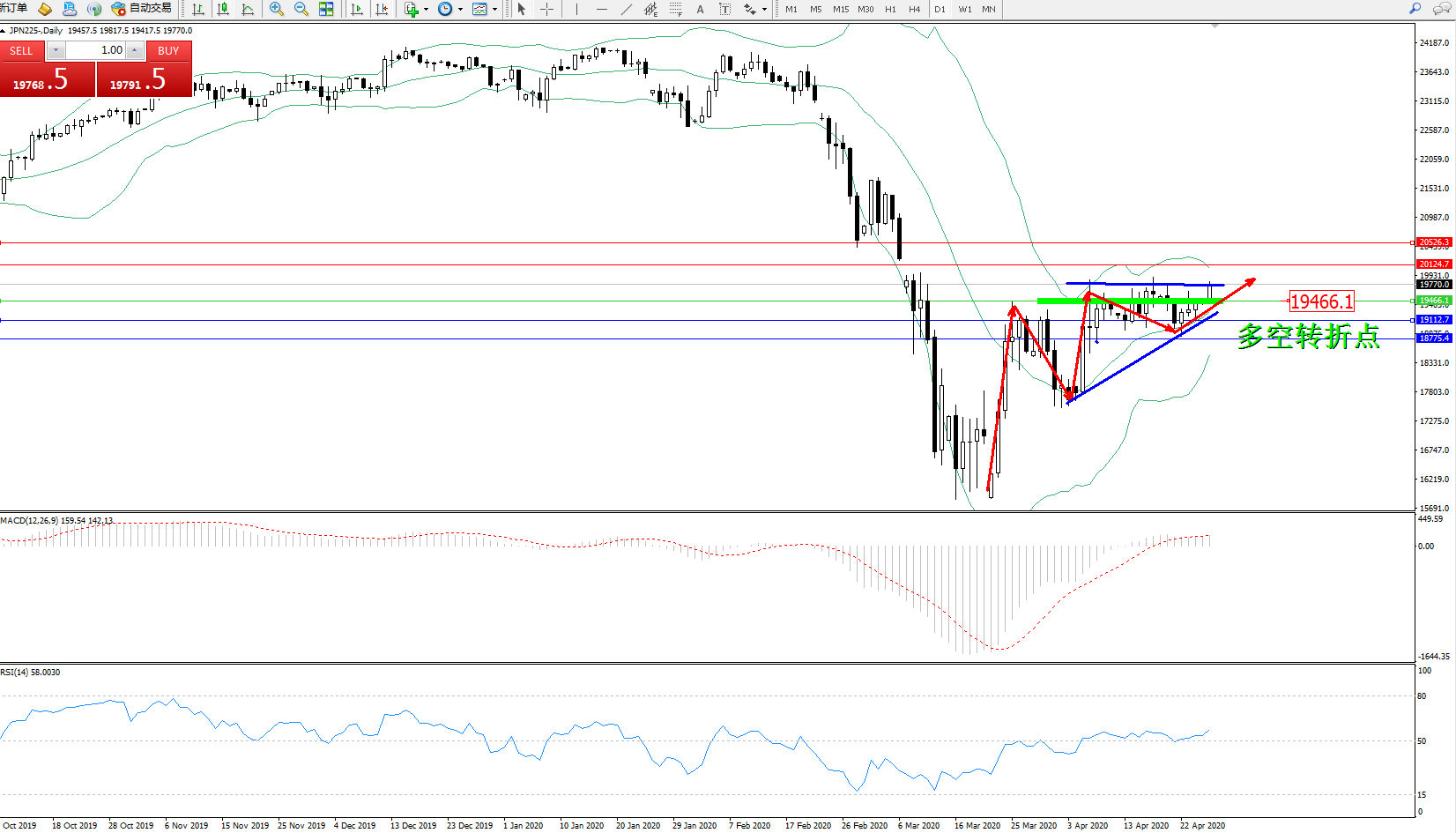 日经225指数4月27日(周一)收盘上涨481.50点,涨幅2.50%,报19743.50点。日本央行周一发布政策决议,维持各项政策决议不变,只是口头承诺将增加公司债的购买力度。这令投资者感到失望。由于日本周三起将进入黄金周假期,因此本周的会议提前举行,并且会期也因为冠状病毒疫情被压缩到一天,但投资者并未从中解读出太多的亮点;市场将目光投向了本周稍后出炉的美联储政策决议,对美联储继续口头强化宽松的预期,连同在周末过后市场风险情绪回温的背景一同,都令美元指数重新承压。